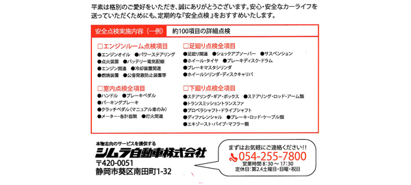 シムラ自動車では「まちとクルマのオアシス」を目指し、オアシス点検(自家用乗用車/軽自動車)も実施しております。